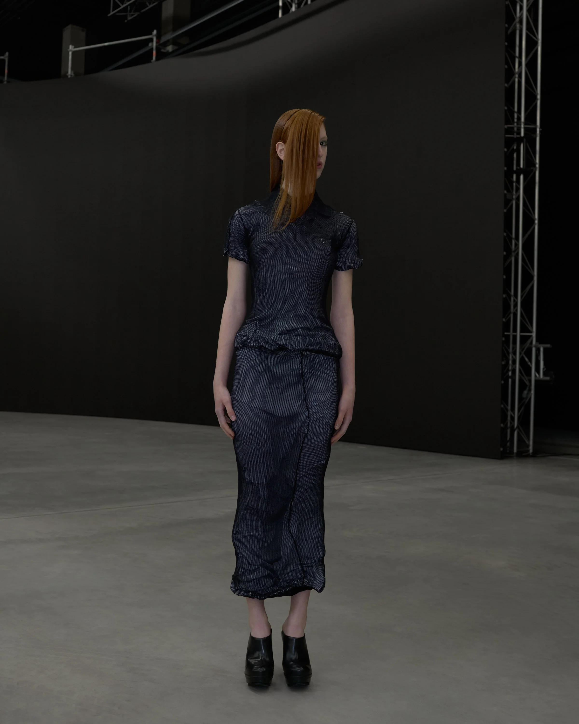 A sculptural double-layer top crafted from lightweight viscose. The outer layer is cut into horizontal slashes, creating dimensional ribbons that drape and move around the body. Each ribbon is applied and positioned by hand for a deconstructed yet controlled finish.